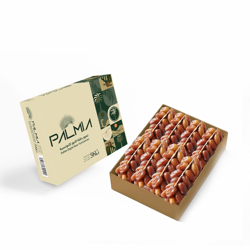 Le conditionnement de 5kg PALMIA est un format classique qui répond aux besoins quotidiens avec praticité. Il offre une belle quantité de dattes branchées soigneusement sélectionnées, tout en préservant leur fraîcheur et leur présentation traditionnelle.